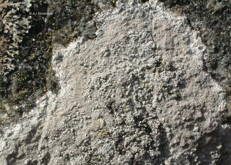 Thalle crustacé gris clair à marge mal délimitée, couvert de soralies blanches hémisphériques (0,5-1,5 mm de diamètre) ayant un goût amer (poser le doigt sur les soralies puis sur la langue).